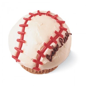 Make a cupcake shaped like a baseball, Family Fun will show you how.